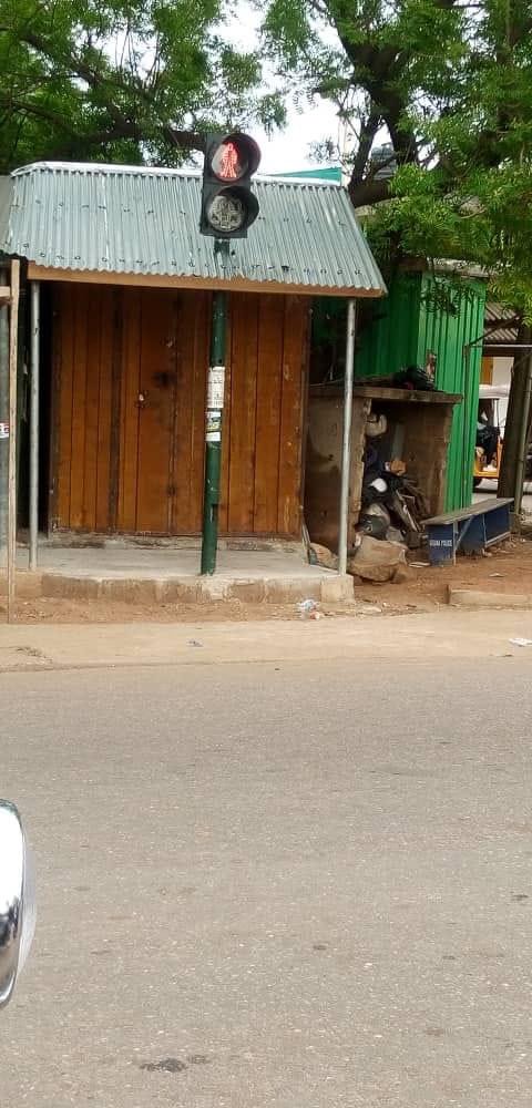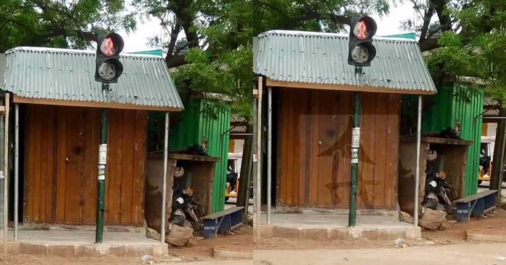 Under this same traffic light sits personnel from the Ghana Police Service to direct smooth vehicular motion.