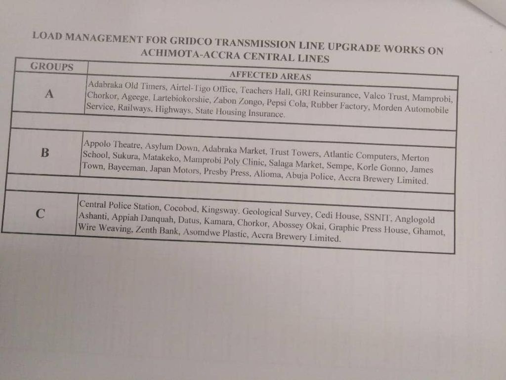 According to the Ghana Grid Company Limited (GRIDCo), the outages are being carried out to carry out “scheduled works” on the Achimota – Accra Central Lines.