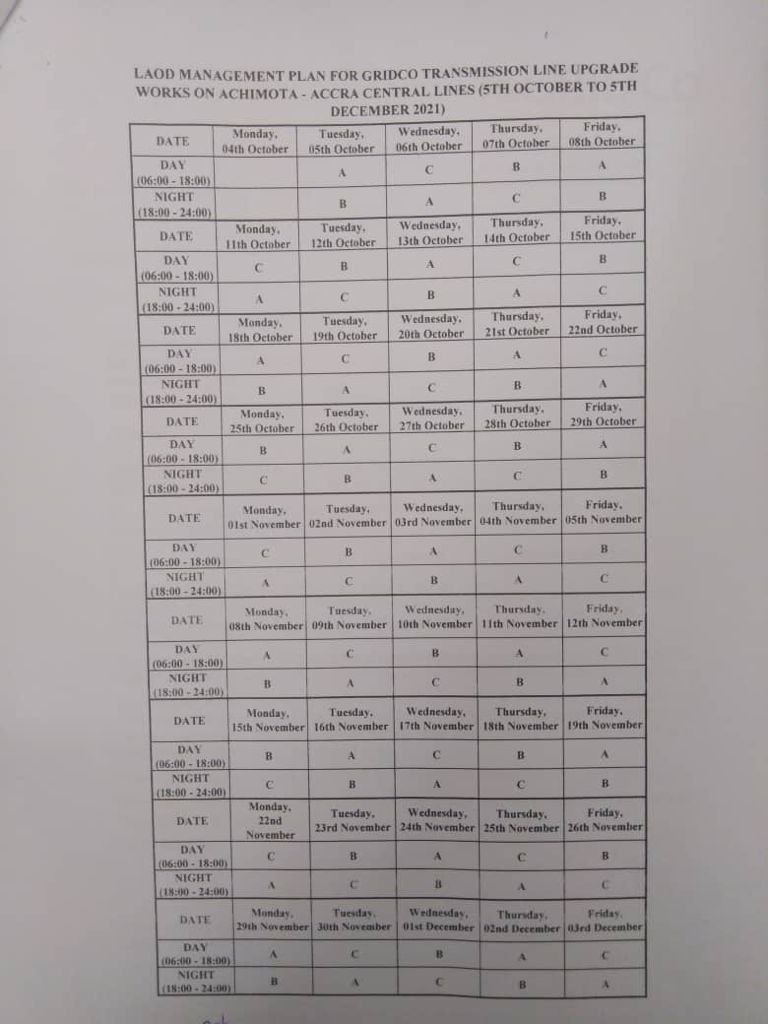 According to a document seen by GhanaWish.com, certain districts of Accra will endure significant power disruptions between October 5 and December 5, 2021.
