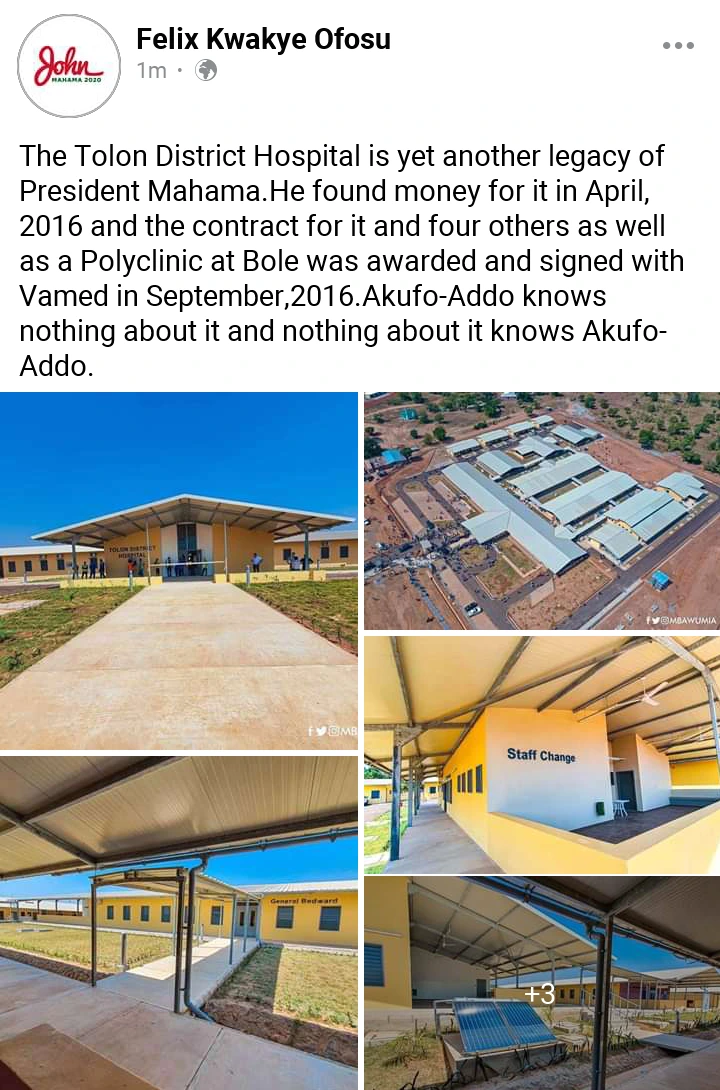 According to the NDC guru, the popular Tolon district hospital is another great legacy of the flag bearer of the opposition National Democratic Congress (NDC), former President John Dramani Mahama and not President Nana Addo Dankwa Akufo-Addo. He stated that President John Dramani Mahama gathered funds for the hospital in the year 2016, April. He also alleged that former President John Dramani Mahama found money for four others too, including the poly clinic in Bole.
