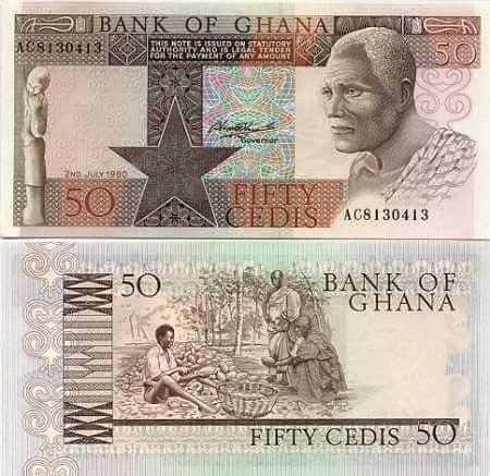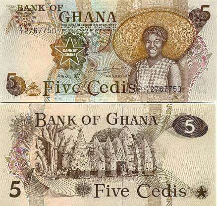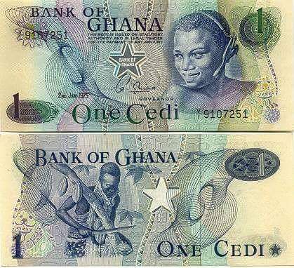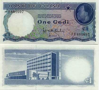 After Ghana gained independence Ghana separated itself from the British West African pound, which was the currency of the British colonies in the region. The new republic’s first independent currency was the Ghanaian pound (1958-1965). In 1965, Ghana decided to leave the British colonial monetary system and adopt the widely accepted decimal system. The African name Cedi (1965-1967) was introduced in place of the old British pound system. Ghana’s first President Kwame Nkrumah introduced Cedi notes and Pesewa coins in July 1965 to replace the Ghanaian pounds, shillings and pence. The cedi bore the portrait of the Kwame Nkrumah and was equivalent to eight shillings and four pence i.e. one hundred old pence, so that 1 pesewa was equal to one penny.