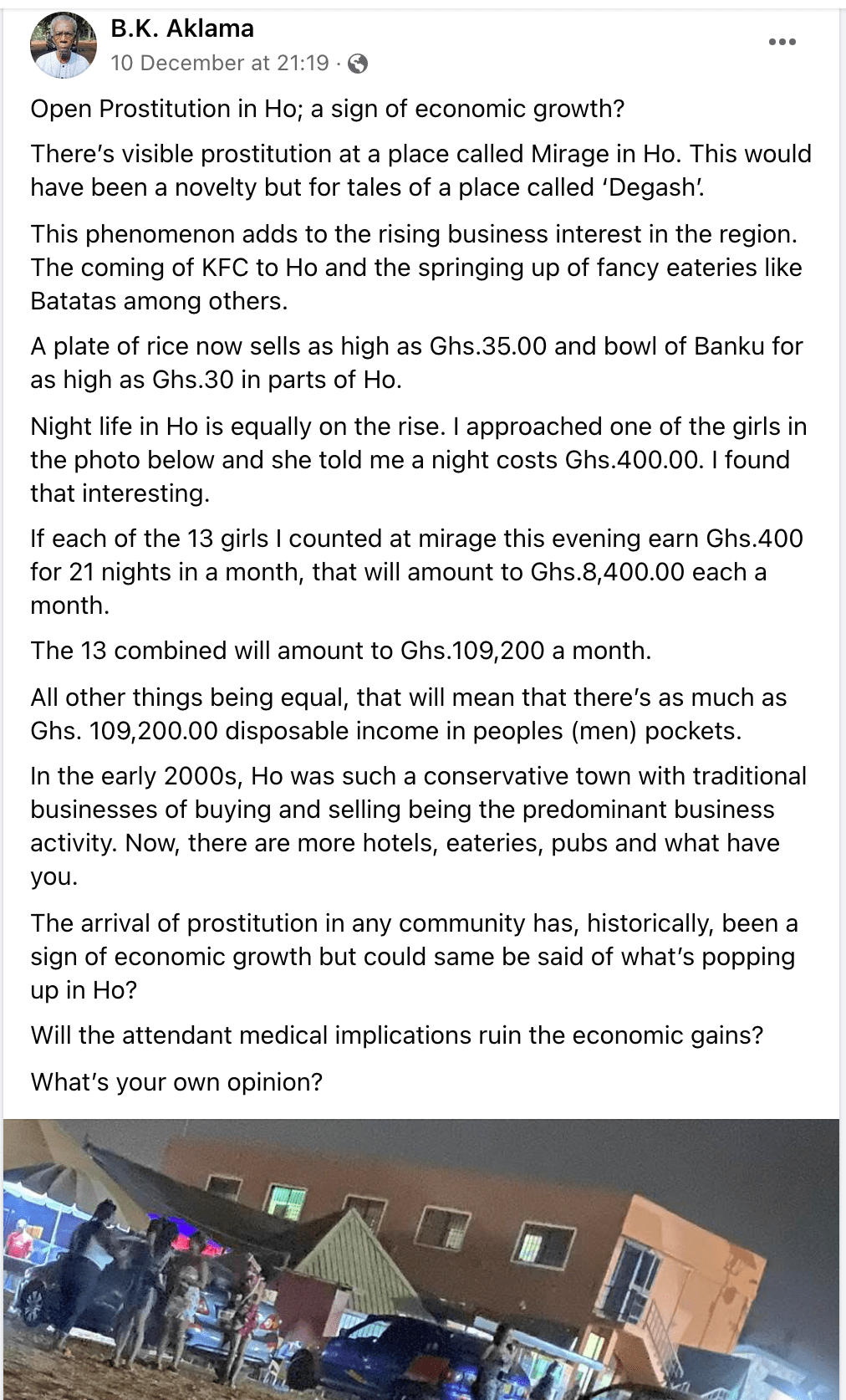 A Ghanaian Facebook user, B.K. Aklama has shed light on how the Ho township is fast evolving- which includes the increase in the standard of living and the price of prostitutes.