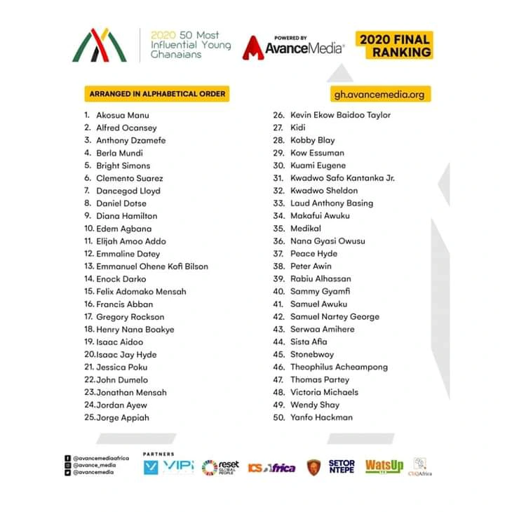Avanche Media has released the list of 50 most influential young. The final rankings arranged in alphabetical order contains the names of prominent Ghanaians from politicians, musicians, entrepreneurs etc. Below is the list.