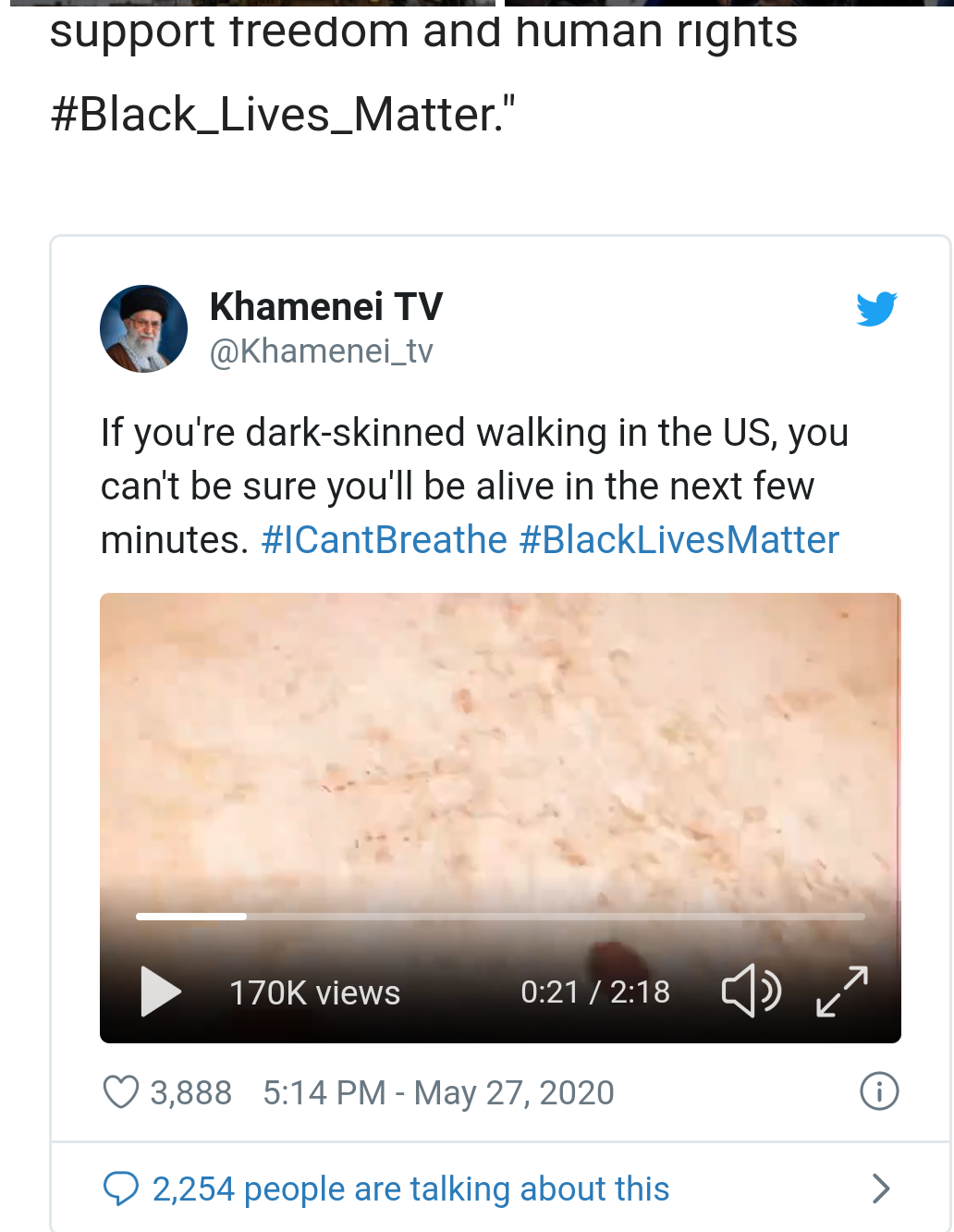 “If you’re dark-skinned strolling in the United States, you can’t make sure you will live in the next few minutes. #ICantBreathe #BlackLivesMatter, “Iran’s Supreme Leader tweeted. “Racial discrimination is still a dilemma in a nation that claims to sustain flexibility and civil rights #Black _ Lives_Matter.