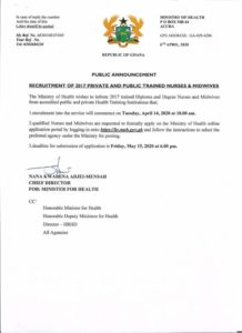 NewsBreaking : Ministry of health is recruiting nurses and other Health professions als by ghwishradioadmin6 April 20206 April 20200503 Share Join us on Telegram