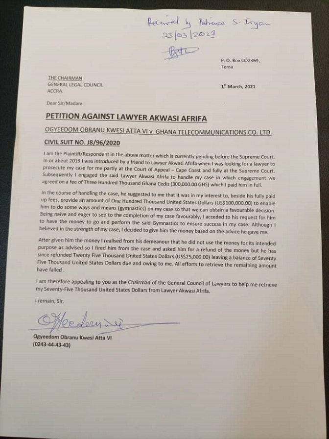 “…so I fired him from the case and asked him to refund the money but he has since refunded US$25,000 leaving a balance of US$75,000 due and owing to me. All efforts to retrieve the amount have failed,” Ogyeedom Obranu Kwesi Atta VI stated while he appealed to the Chairman of the Ghana Legal Council to help him retrieve the remaining amount from lawyer Kwasi Afrifa.