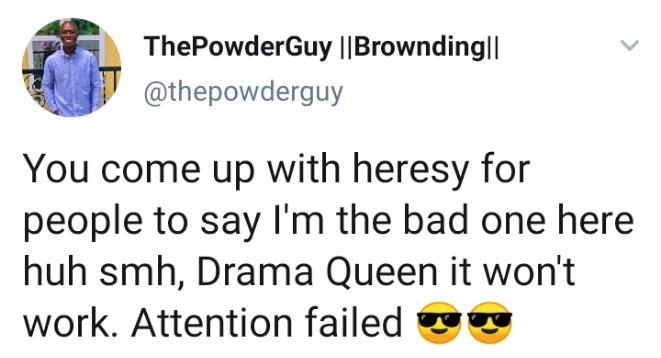 “You come up with heresy for people to say I’m the bad one here. Huh smh. Drama queen it won’t work. Attention failed.”