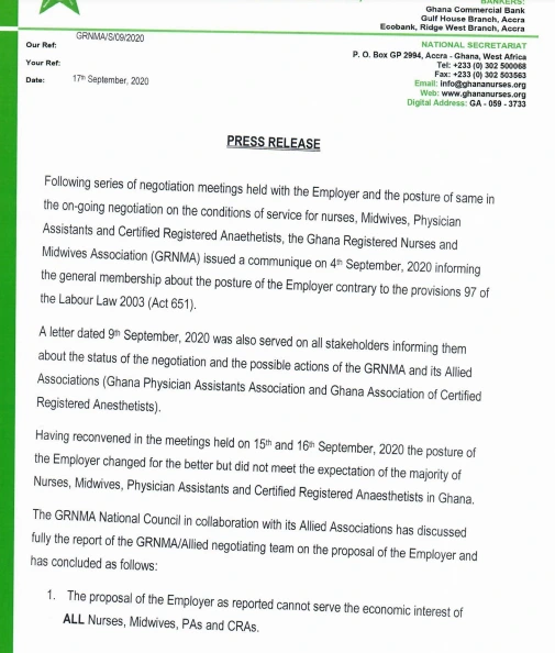 “Following series of negotiation meetings held with the Employer and the posture of same in the ongoing negotiation on the conditions of services for nurses, midwives, physician assistants and certified registered anaethetists, the Ghana Registered Nurses and Midwives Association (GRNMA) issued a communique on 4th September, 2020 informing the general membership about the posture of the Employer contrary to the provisions 97 of the Labour Law 2003 (Act 651),” part of the statement reads.