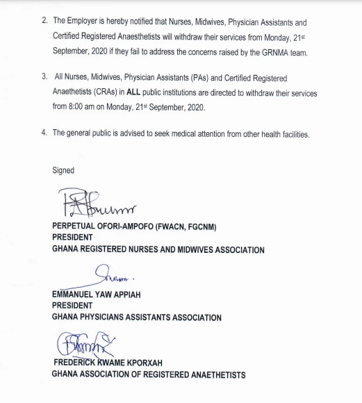 They add, “The employer is hereby notified that Nurses, midwives, physician assistants and certified registered anaethetists will withdraw their services from Monday, 21st September, 2020 if they fail to address the concerns raised by the GRNMA team.”