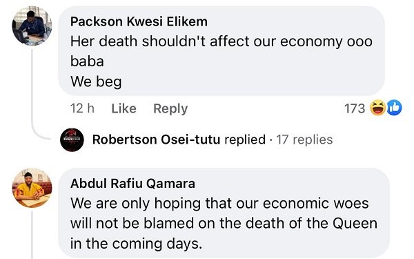 “Her death shouldn’t affect our economy ooo baba. We beg,” a Facebook user with the name Packson Kwesi Elikem wrote under the president’s post.