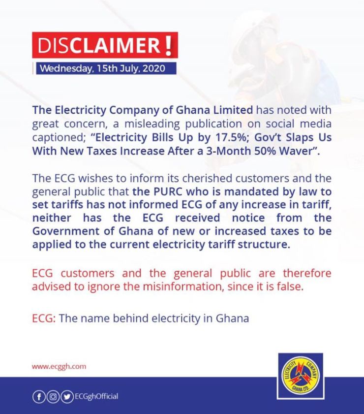 The ECG wishes to inform its cherished customers and the general public that the PURC who is mandated by law to set tariffs has not informed ECG of any increase in tariff, neither has the ECG received notice from the Government of Ghana of new or increased taxes to be applied to the current electricity tariff structure.”