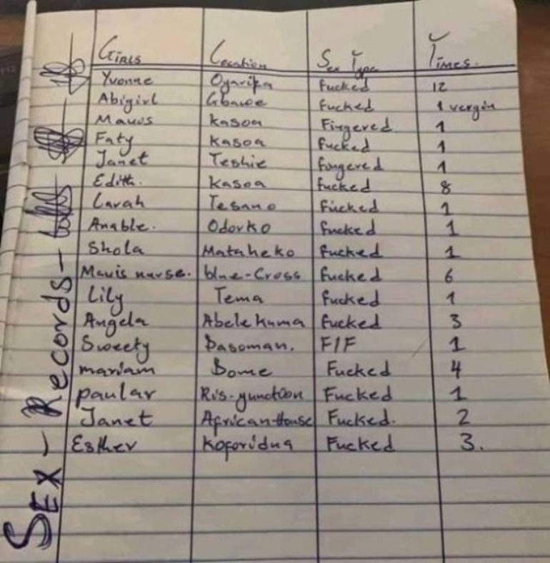 The list which he titled, ‘sex record’ also shows a category that illustrates the kind of sexual activity involved, whether he penetrated them or merely ‘fingered’ them. The list has since gone viral, attracting mixed reactions from the online community.
