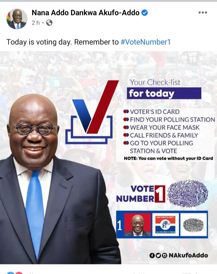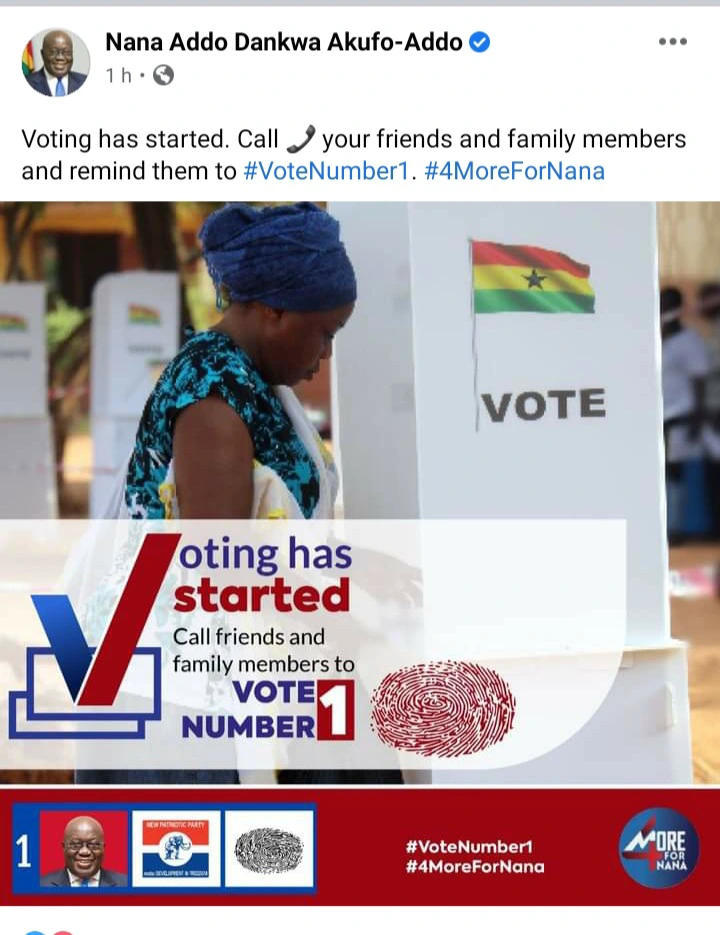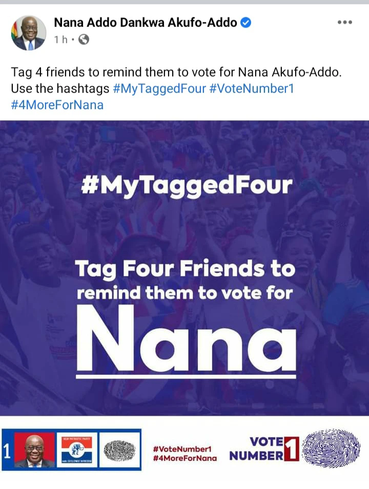 Over the early hours of today he has shared similar messages to his followers and Ghanaians on Facebook to vote for him. He also urged them to ring their friends and families to vote for him. In other post he urged them to tag 4 friends to vote number 1 meaning him and the NPP.