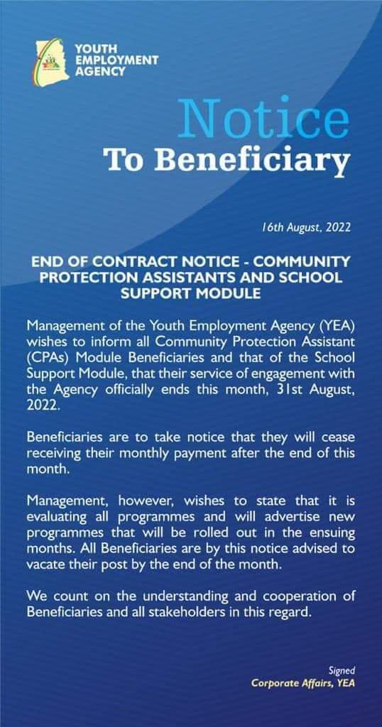 The Youth Employment Agency (YEA) in August last month informed beneficiaries under the Community Protection Assistants and School Support Module that their contract was over.