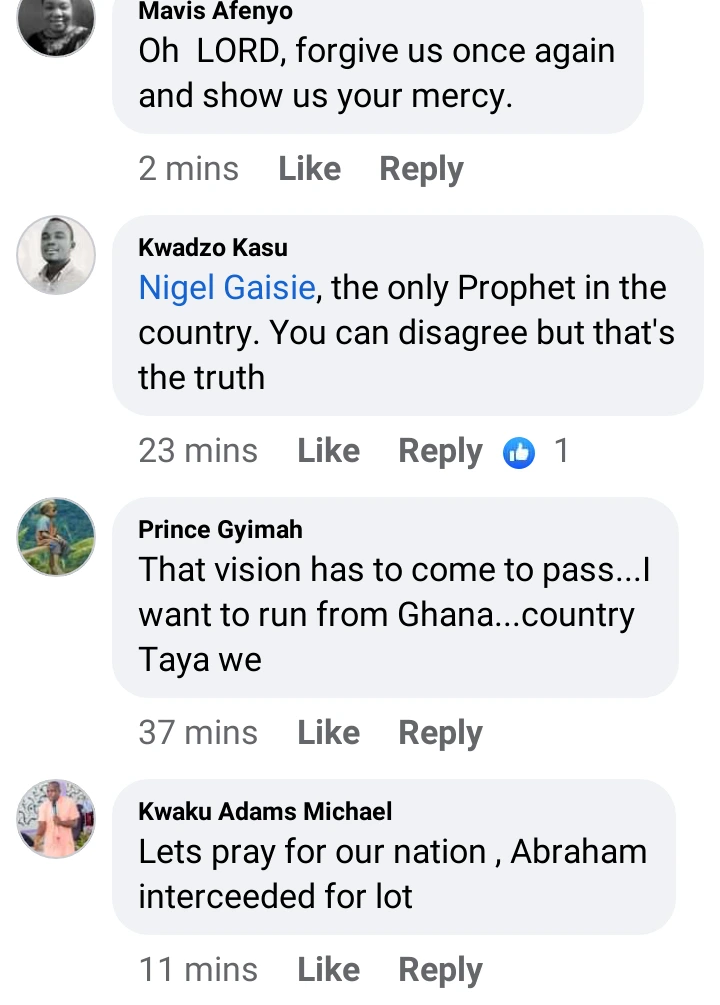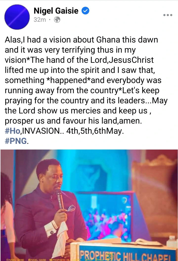 Nigel Gaisie declared emphatically in a recent Facebook post that he experienced a scary vision. Something had happened in the land, he saw in the vision.