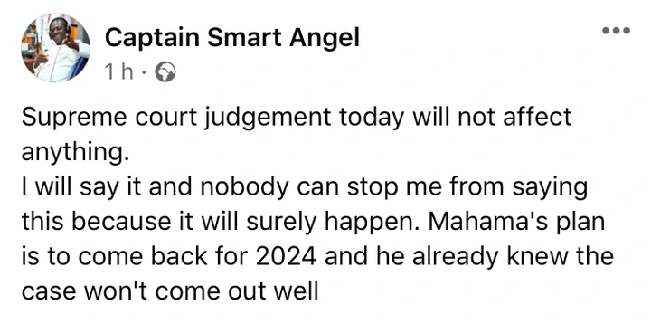 According to the Angel TV host, he revealed that the National Democratic Congress (NDC) 2020 election Presidential candidate John Mahama is planning to come back in 2024 Presidential election. Captain Smart went further to deep his mouth on the Supreme Court judgement today as he clearly stated that the judgement from the Supreme Court will not affect anything.