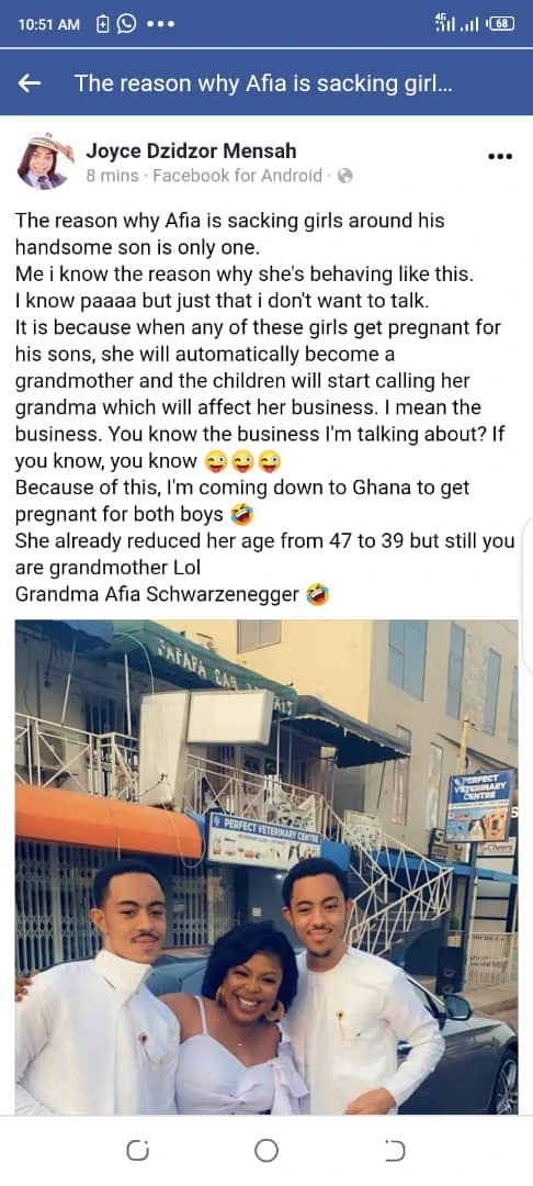 She added that, because of what Afia Schwarzenegger is doing, she will come down to Ghana to get pregnant for both boys. Why should you reduced your age from 47 to 39 of which you’re still a grandmother. “she hints”