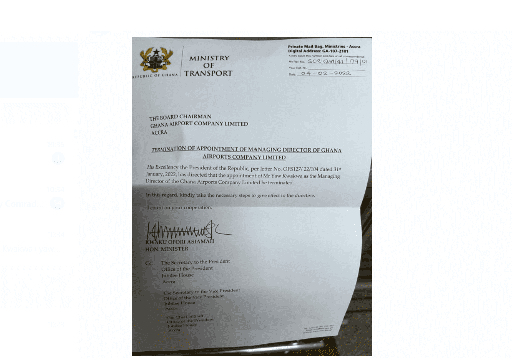 Announcing the termination of the appointment, the Transport Minister Kwaku Ofori Asiamah in a letter said “His Excellency the President, per letter No. 0P S127/22/104, dated 31st January 2022, has directed the appointment of Mr Yaw Kwakwa as Managing Director of the Ghana Airport’s Company Limited be terminated,”