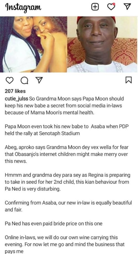 Blogger cutie juls alleged that the husband of Regina Daniels, Ned Nwoko has gotten married to another fair-skinned lady while she’s busily touring around the world with her son.