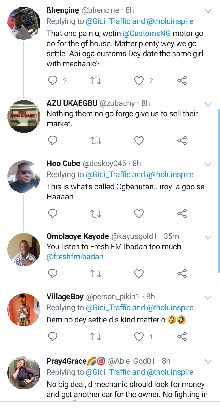 A Twitter client responding stated, “That one torment you, what’s Nigerian Customs vehicle doing at a similar area where the occurrence occurred? Matter bounty wey we go settle. Or on the other hand oga customs dey date a similar young lady with specialist?