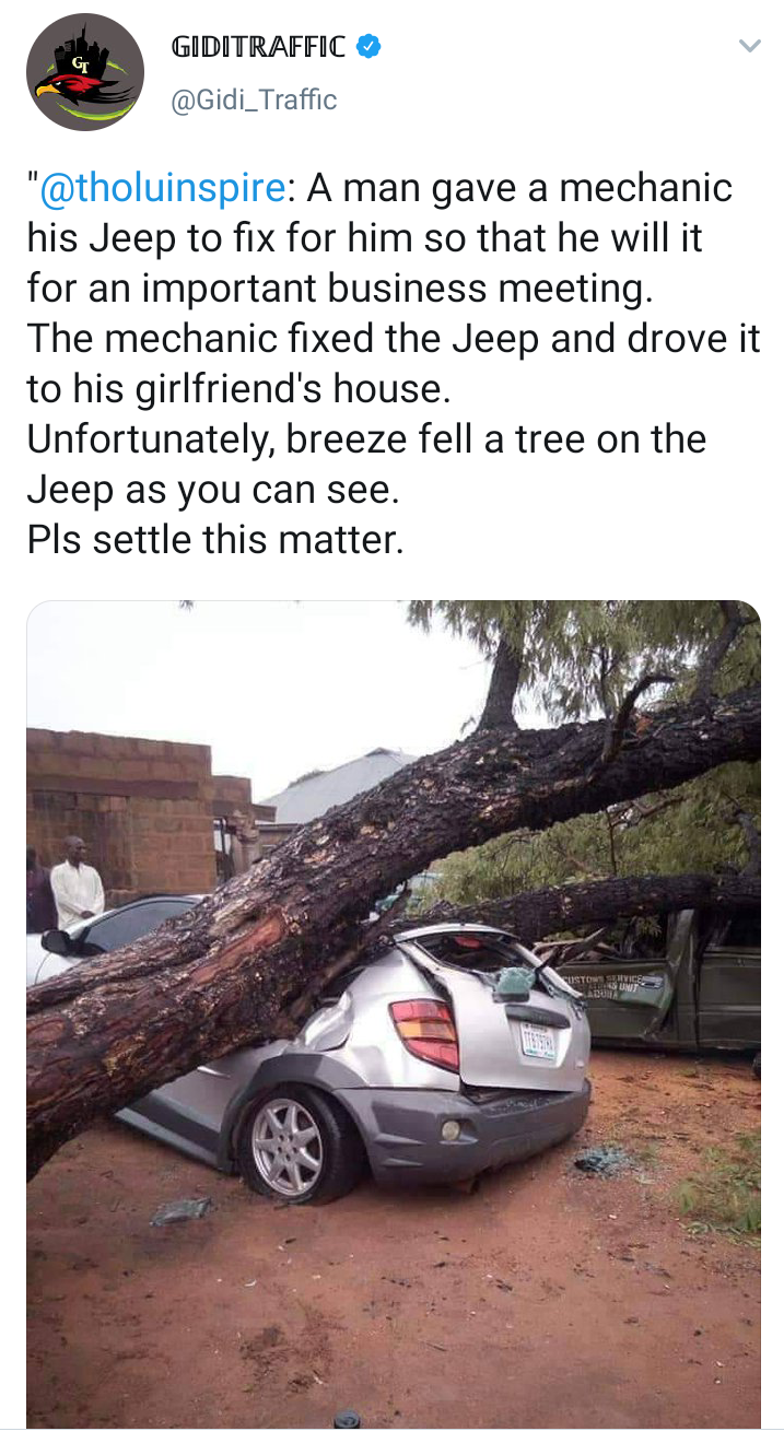 The tweet which was tweeted by @tholuinspire and was retweeted by Gidi Traffic, made it realized that the proprietor of the vehicle needed to take in for a significant conference, before it was obliterated by the tree that fell on it.