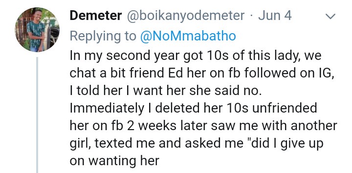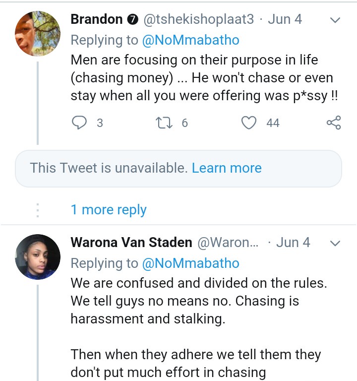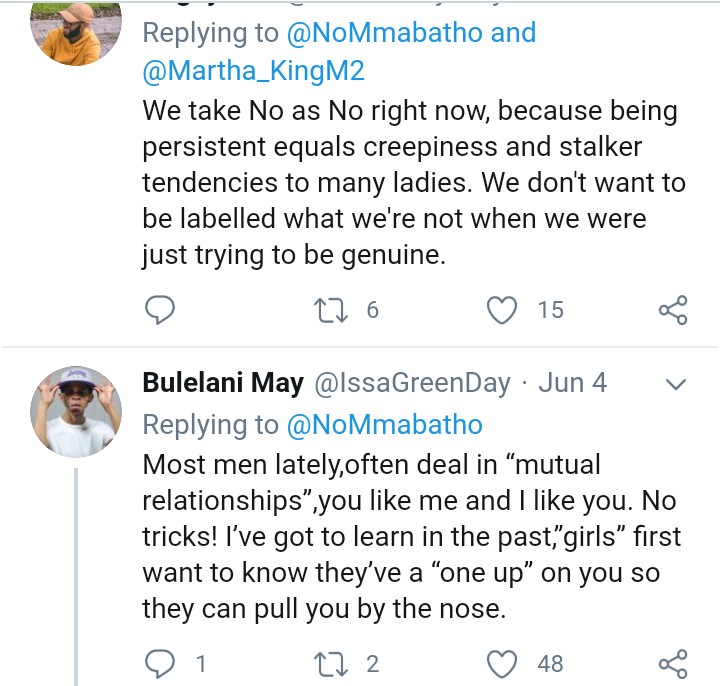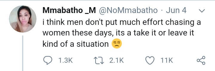 A South African lady recently took to social media to reveal that men are no longer as persistent as they used to be when wooing a lady. According to the beaitiful lady identified simply as Mmabatho, she lamented that men no longer chase women as they used to and it’s now a two-way thing -Either you say yes or no.Here is what she wrote: “I think men don’t put much effort chasing a woman these days, it’s a take it or leave it kind of a situation 😒