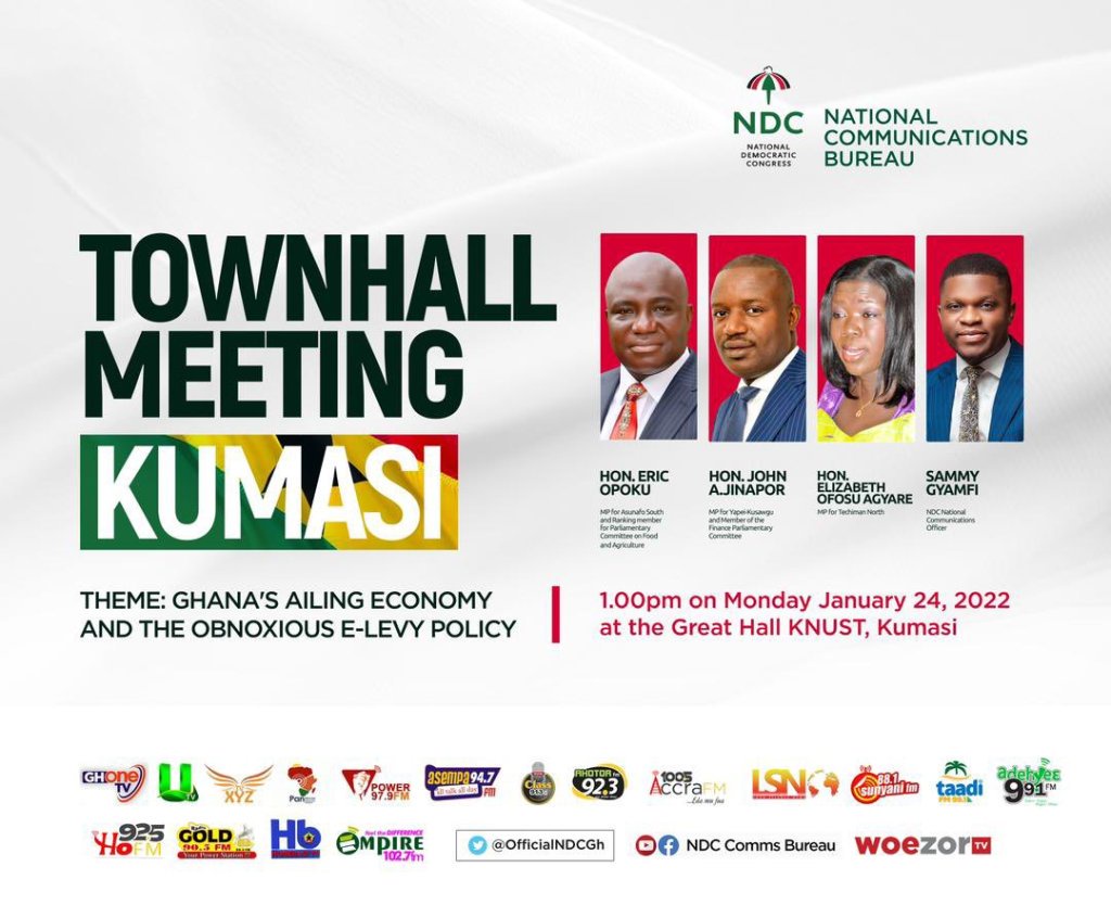 The National Democratic Congress (NDC) has announced that it will hold Town-Hall meeting in the city of Kumasi on Monday, 24th January, 2022.