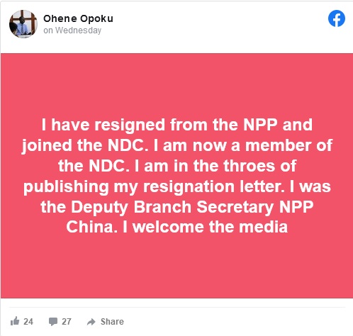 A member of the New Patriotic Party (NPP) branch in China, Dr Ohene Poku has resigned to join the main opposition National Democratic Congress (NDC).