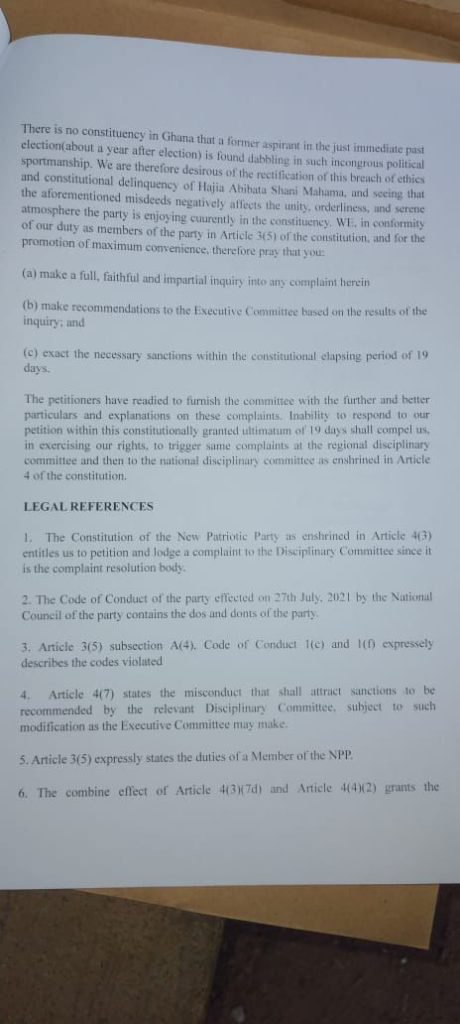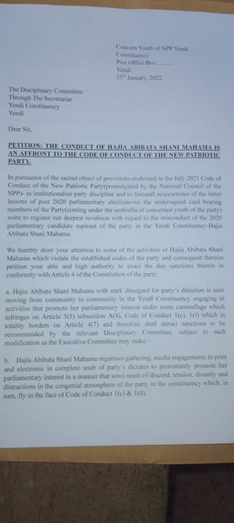 “Hajia Abibata Shani Mahama organises gathering, media engagements in print and electronic in a complete snub of party’s dictates to prematurely promote her parliamentary interest in a manner that sows seeds of discord, tension, disunity and distractions in the congenial atmosphere of the party in the constituency which, in sum, fly in the face of Code of Conduct 1(c) & 1(d),” portions of the petition alleged.