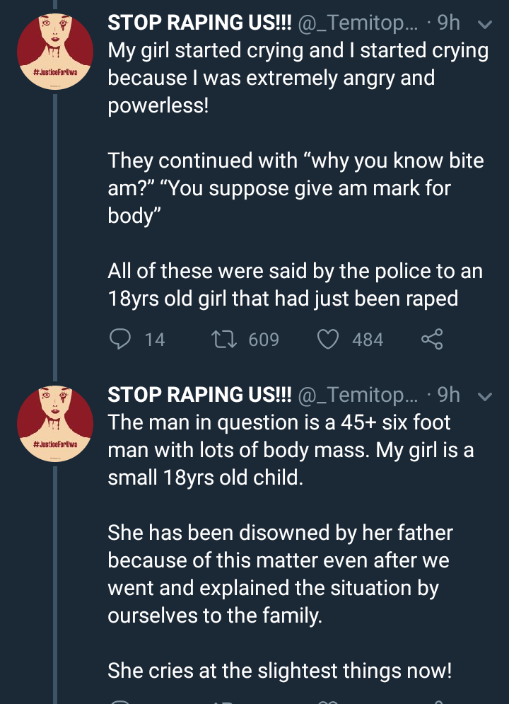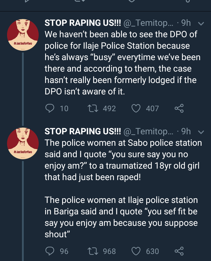 The lady who verified the news of the rape on Twitter, said the victim is indeed her staff. She narrated how they have met dead ends everywhere they took the matter to. She said the hospital staff at LUTH who are supposed to administer PEP said they could not do it since charges were being pressed.