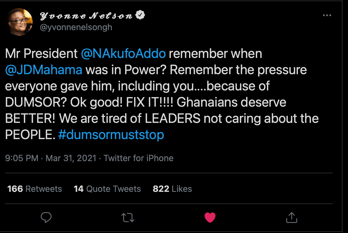 She wrote: Mr President @NAkufoAddo remember when @JDMahama was in Power? Remember the pressure everyone gave him, including you….because of DUMSOR? Ok good! FIX IT!!!! Ghanaians deserve BETTER! We are tired of LEADERS not caring about the PEOPLE. #dumsormuststop