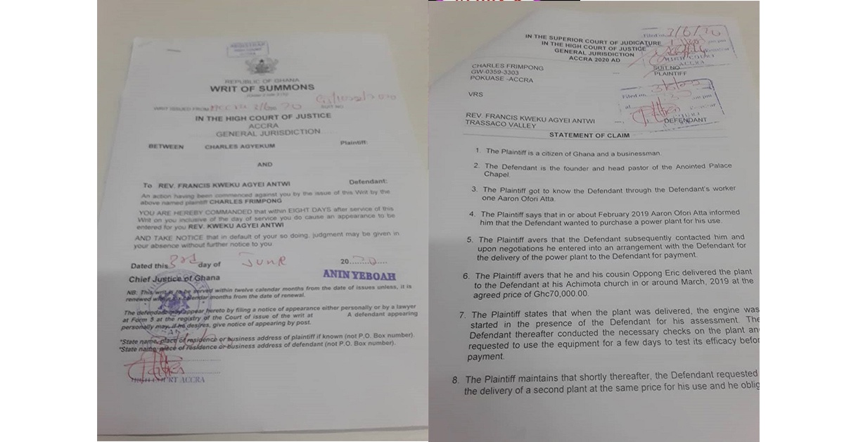 The suit which has been sighted was filed by Mr. Frimpong through his lawyers Awooner Law Consultancy. The suit claim Rev. Obofour owes him an amount of money for services rendered which he has refused to pay. Mr. Frimpong is the Chief Executive Officer of Salt Media Ghana, according to him, a power plant worth GHC 70,000 was delivered to Rev. Obofour at his church premises in Achimota upon request.