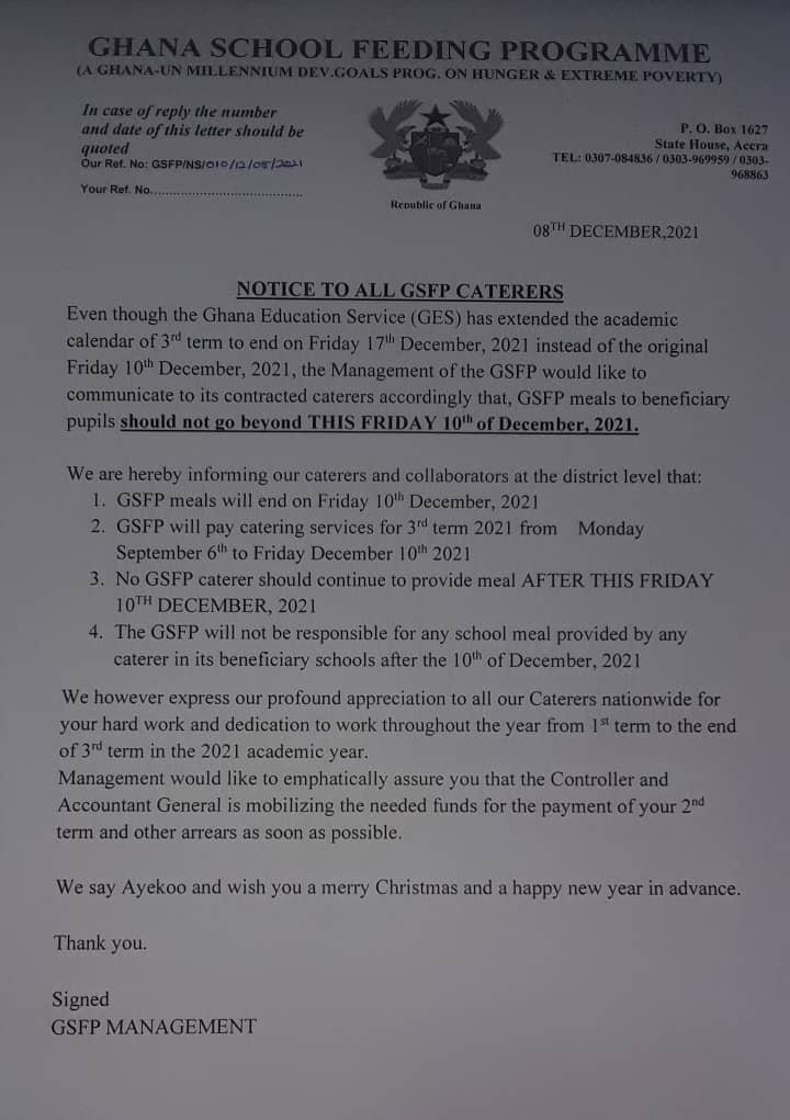 “We are hereby informing our caterers and collaborators at the district level that GSFP meals will end on Friday, 10th December, 2021″, said a statement from management of the programme.
