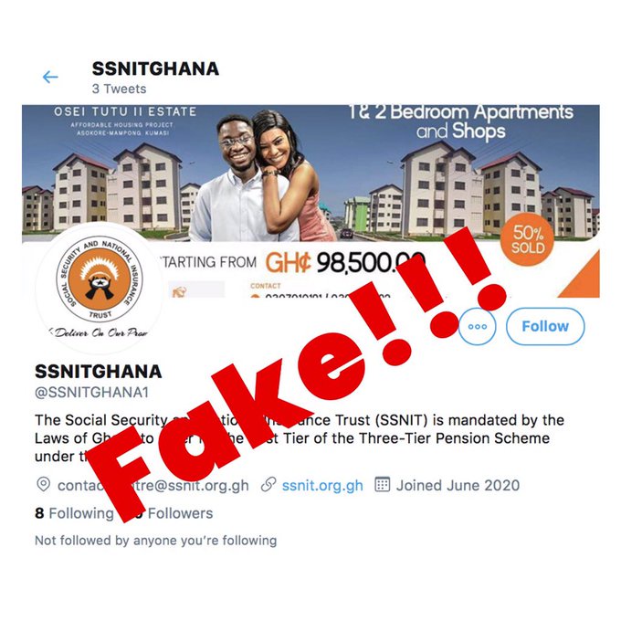 The fake account has every description similar to the official notice of SSNIT with regards to the sales of the project. The general public is advised not to transact any business through that fake account.
