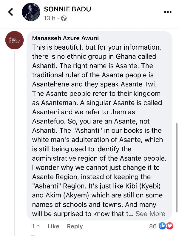 “This is beautiful, but for your information, there is no ethnic group in Ghana called Ashanti. The right name is Asante. The traditional ruler of the Asante people is Asantehene and they speak Asante Twi. The Asante people refer to their kingdom as Asanteman. A singular Asante is called Asanteni and we refer to them as Asantefuo. So, you are an Asante, not Ashanti.