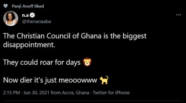 The Christian Council of Ghana is the biggest disappointment. They could roar for days. Now dier it’s just meooowww