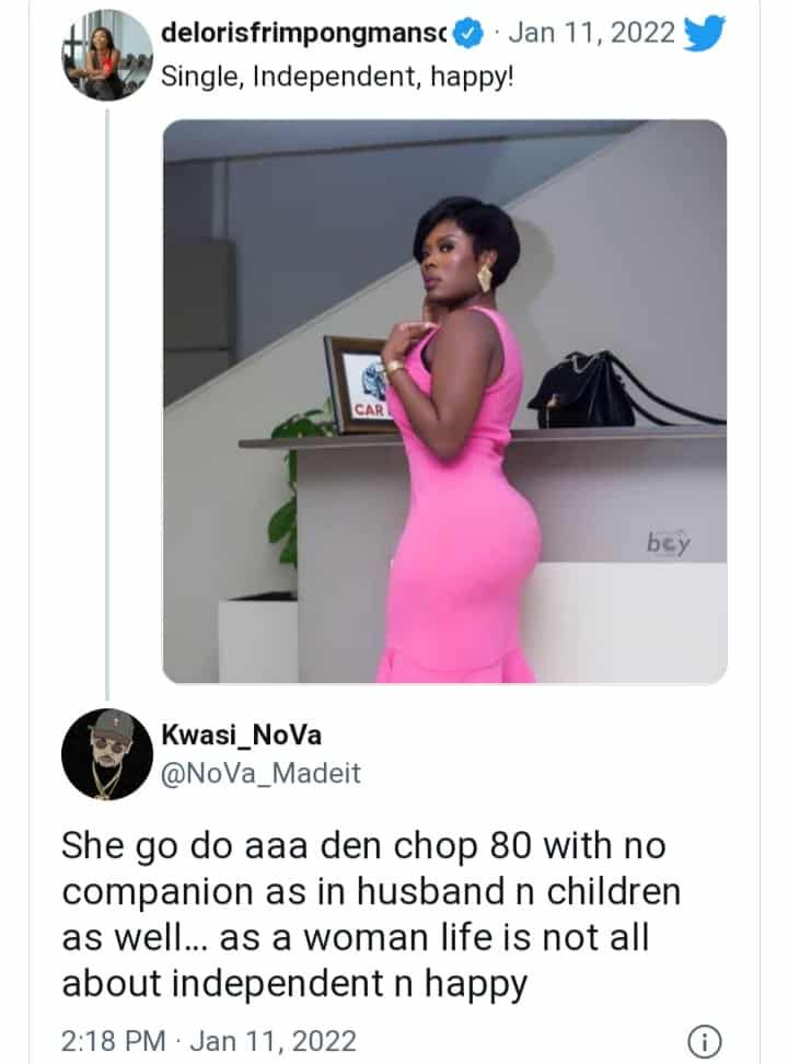 One of these cyberbullies who can be identified as @Nova_Madit on the microblogging platform mocked Delay that she will be 80 years with no husband or children.