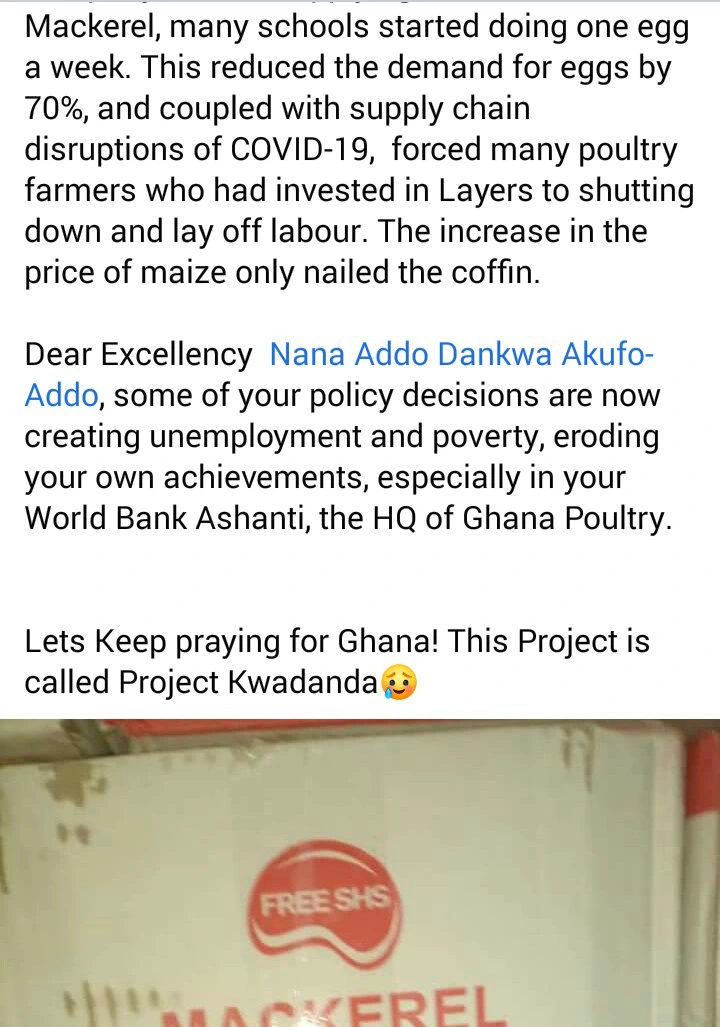“Dear Excellency Nana Addo Dankwa Akufo-Addo, some of your policy decisions are now creating unemployment and poverty, eroding your own achievements, especially in your World Bank Ashanti, the HQ of Ghana Poultry”, he said.