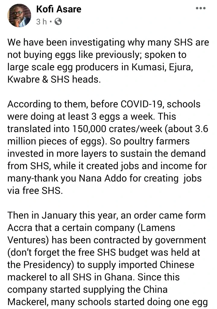 However, government has signed a contract with a Chinese firm, Lamens Ventures, to import Chinese mackerel into our various Senior High Schools (SHSs). The demand for eggs has been reduced drastically due to the substitute of eggs for Chinese Mackerel and other external shocks.